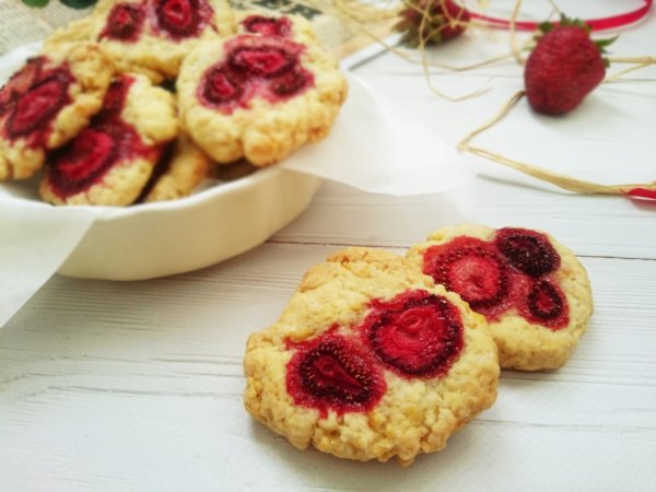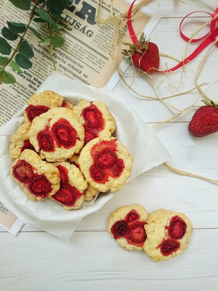 Az epret felkarikázzuk és a sütik tetejére pakoljuk.