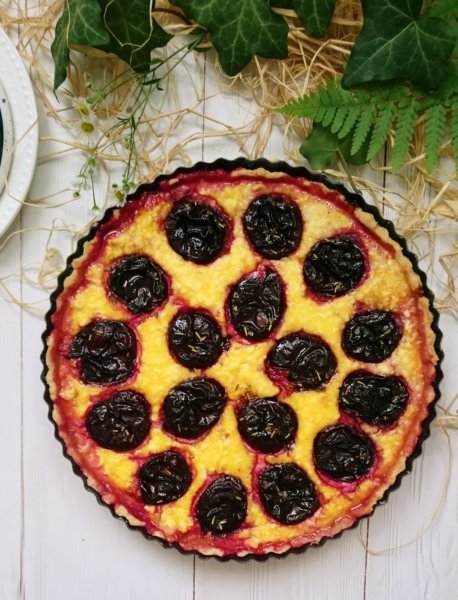 Tegyük bele a tésztát, öntsük rá a tölteléket és rendezzük el rajta az ízesített szilvát.